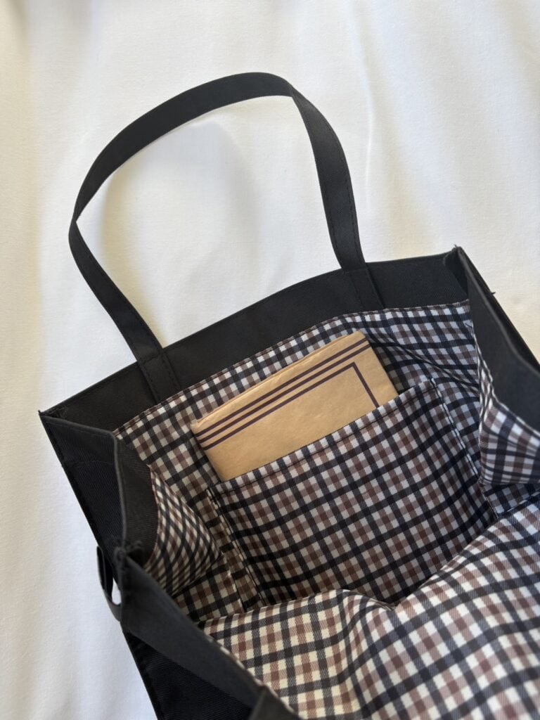 裏地は全面クラブチェック柄! ちょっとした小物の仕分けに便利なポケットつきです。文庫本がすっぽり入るサイズのポケットは、お財布やカギを入れるのにもよさそう。