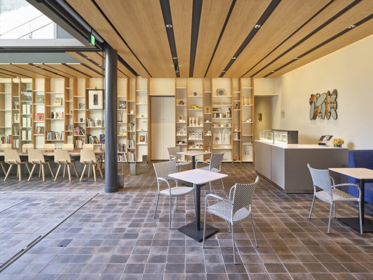 1階にはヨックモックグループ内ハイエンドブランド「アン グラン」のミニャルディーズ(ひとつまみサイズのかわいいスイーツ)や、ラザニアやクラブハウスサンドイッチなどの軽食がいただける「カフェ ヴァローリス」が。カフェから見通せるスペースにはショップやライブラリーも併設しています。展示会に合わせた期間限定のメニューやイベントも見逃せません!