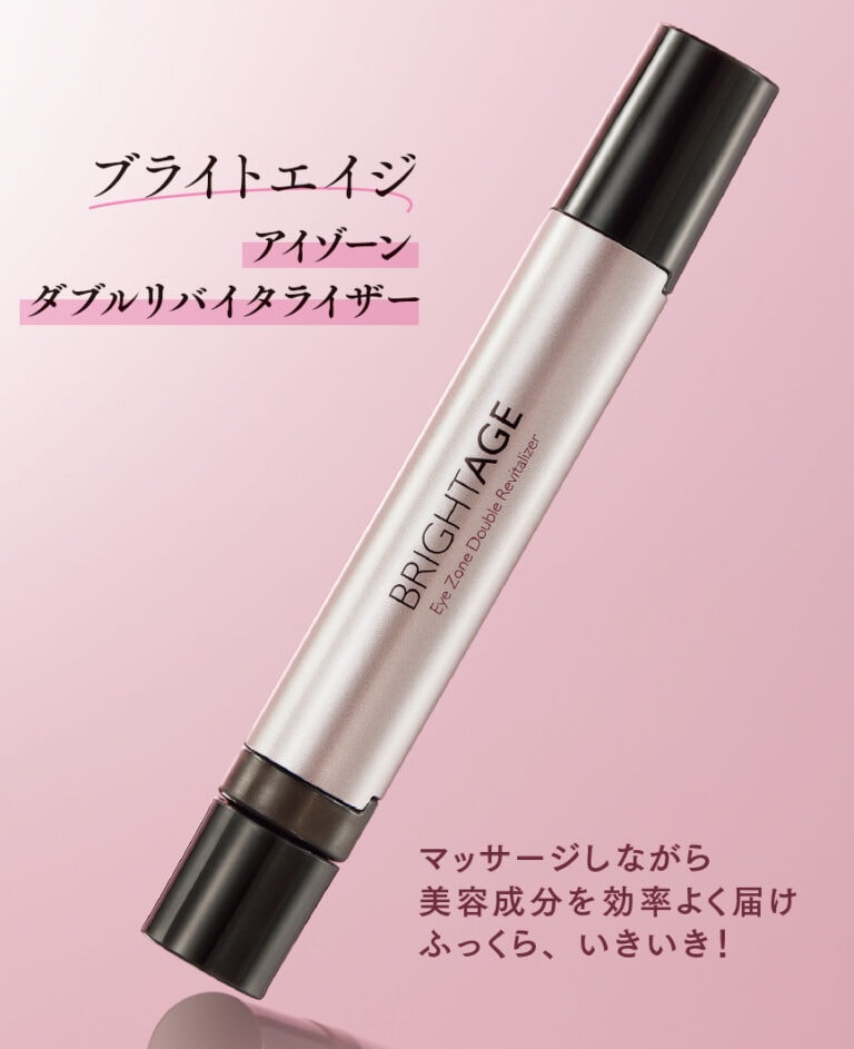 エイジングの一因である年齢肌炎症*5に着目し研究を続けるブライトエイジ。年齢を感じやすい目もとを、本気でトータルケアするために、開発に7年を費やして完成したのが、『アイゾーン ダブルリバイタライザー』です。みずみずしいセラムとしっとりバームをひとつにした2イン1容器は、マッサージをしながらお手入れができる新発想。製薬会社がこだわった設計も魅力です。使いやすいから続けられ目もとの本格ケアが叶う。その好循環を、ぜひ肌で試してみてください。