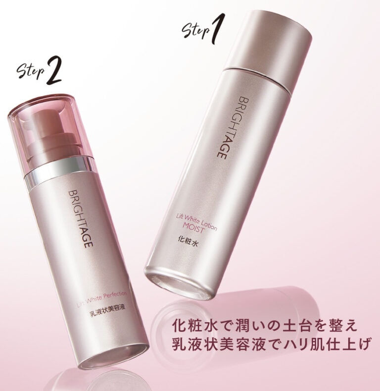 ブライトエイジ リフトホワイト ローション モイスト[医薬部外品](販売名:B化粧水a)120㎖ ¥5,500(税込)、ブライトエイジ リフトホワイト パーフェクション[医薬部外品](販売名:B乳液状美容液a)40g ¥8,800(税込)