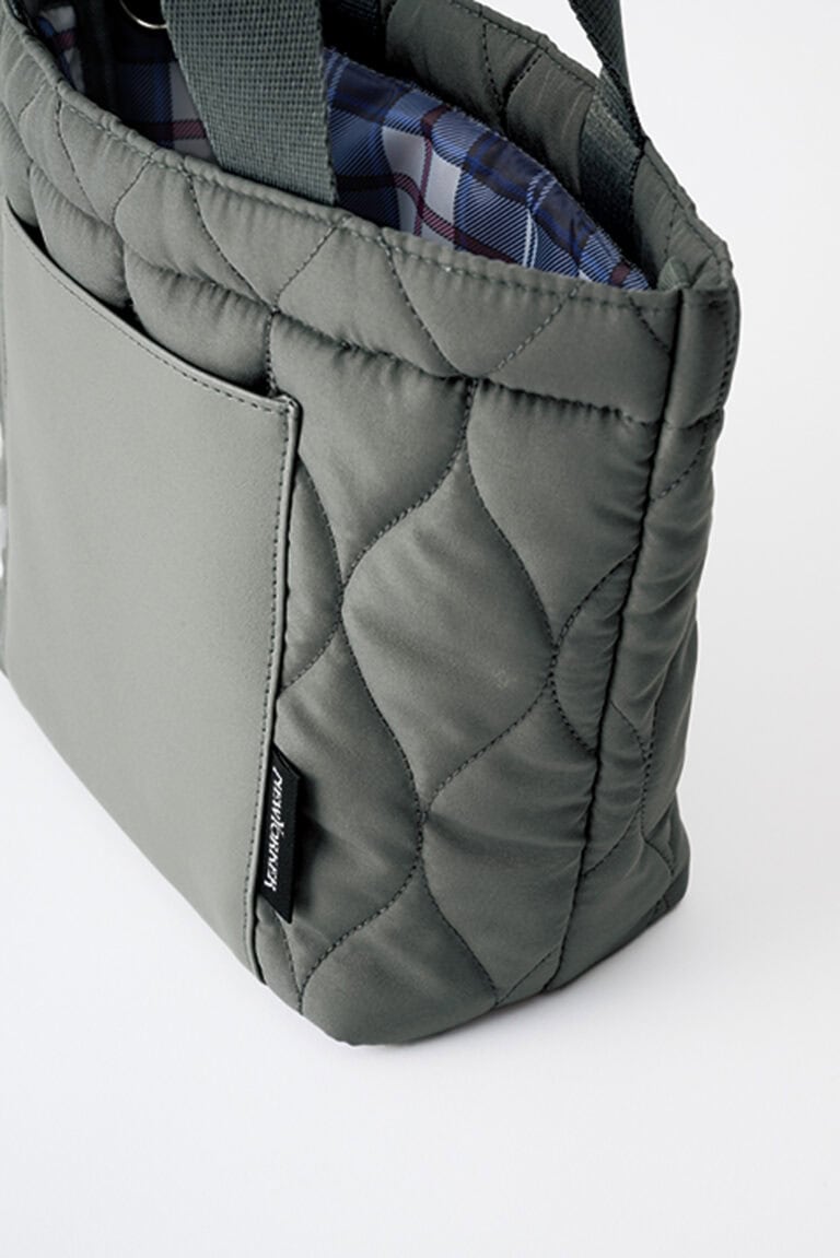 上品なグレーのキルティングバッグは、マニッシュなコーデにも好相性。きちんと感は残しつつ、大人らしい上品カジュアルスタイルが完成します。