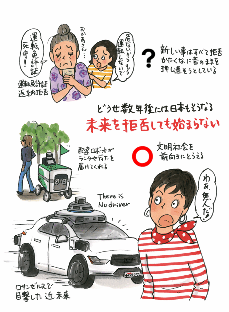 L.A.に住んでいる高齢者の友人は、「こっちでは車がないと生活できないから、将来、運転できなくなった際に、無人タクシーや宅配ロボットは絶対に必要なのよ」と熱烈歓迎派だった。