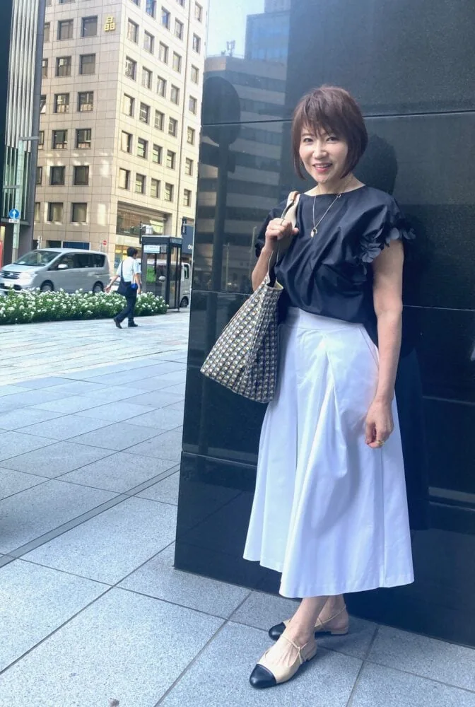 エレガントに着こなすモノトーンのフリルトップスで大人カジュアルなコーディネート