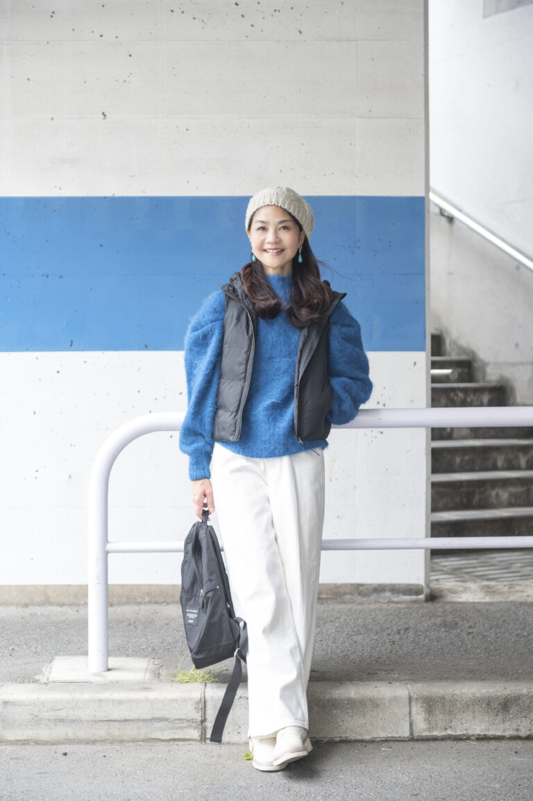 青×白ならカジュアルなアイテムの組み合わせでも、クリーンで気品漂う印象に。「〇〇のダウンベストとリュックを黒に統一。さりげなく締め色効果を発揮してくれて、かわいくなりすぎず大人っぽく仕上がりました」(桜井さん)