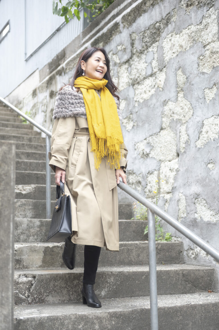 「ともすると春のフレッシュ感が際立ってしまうトレンチコートには、秋・冬ならではのふわふわな素材を合わせることで、季節感とともに上品さを加味できます」(桜井さん)。ファーとトレンチコートに馴染みやすいイエローのストールをレイヤードして、顔まわりが華やかに。視線を上に集中させることで、トレンチコートの重心も下がらずバランスのとれた着こなしに。