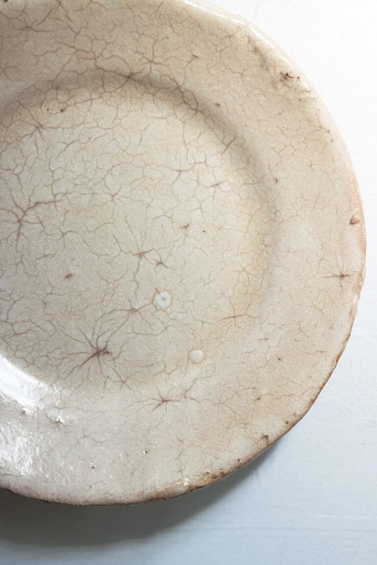 貫入が美しい新作。白化粧を施した後に無色透明の釉をかけ、さらに漆を塗るという手の込みようです。φ20×H2.5㎝ 9,900円。「漆をふいてあるので、通常の貫入よりもゆっくり経年変化するはず。その過程も楽しみながら使っていただきたいですね」と島田さん。