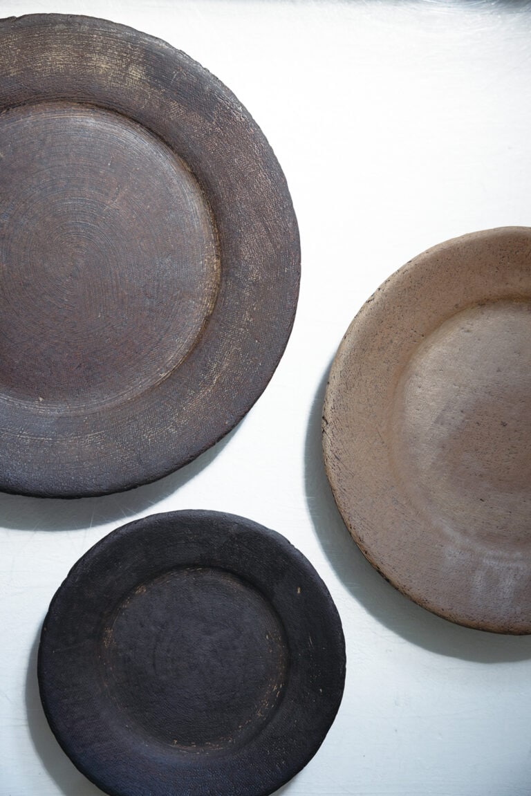 形のいい石や美しい枝ぶりなど、自然が織りなす無作為の美を目指しているという上田さん。何げない皿もリムと見込みのバランスが絶妙で、和洋を問わず料理が映えます。左上からφ 23.5 × H1.5 ㎝ 11,550円。中央のふき漆の皿φ20×H1.5㎝、下φ15×H1.5㎝ 各6,600円。