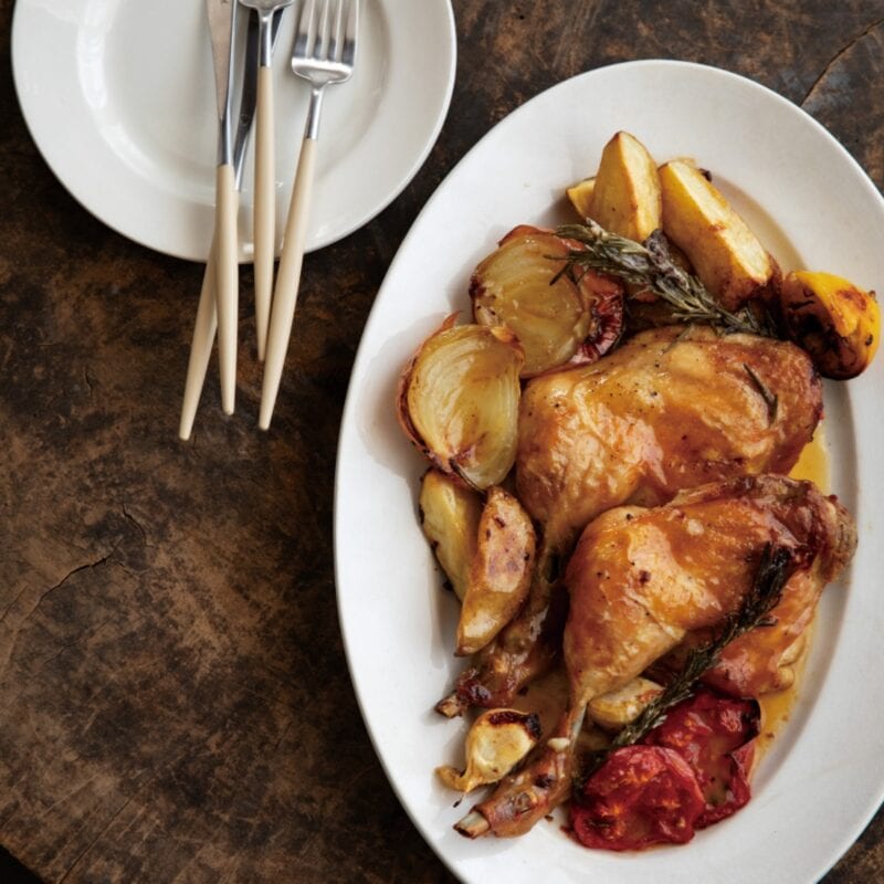 華やかな風味が広がる、ジューシーな骨つき肉が最高! ローズマリーは鶏肉の下に入れ、焦がさずに焼くと◎。