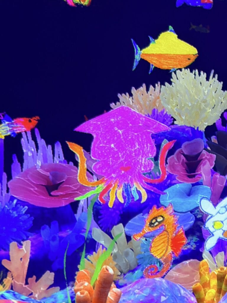 海に魚が泳いでいるのですが、自分が描いた魚(塗り絵)がスキャンしてもらうと海で泳ぐんです。