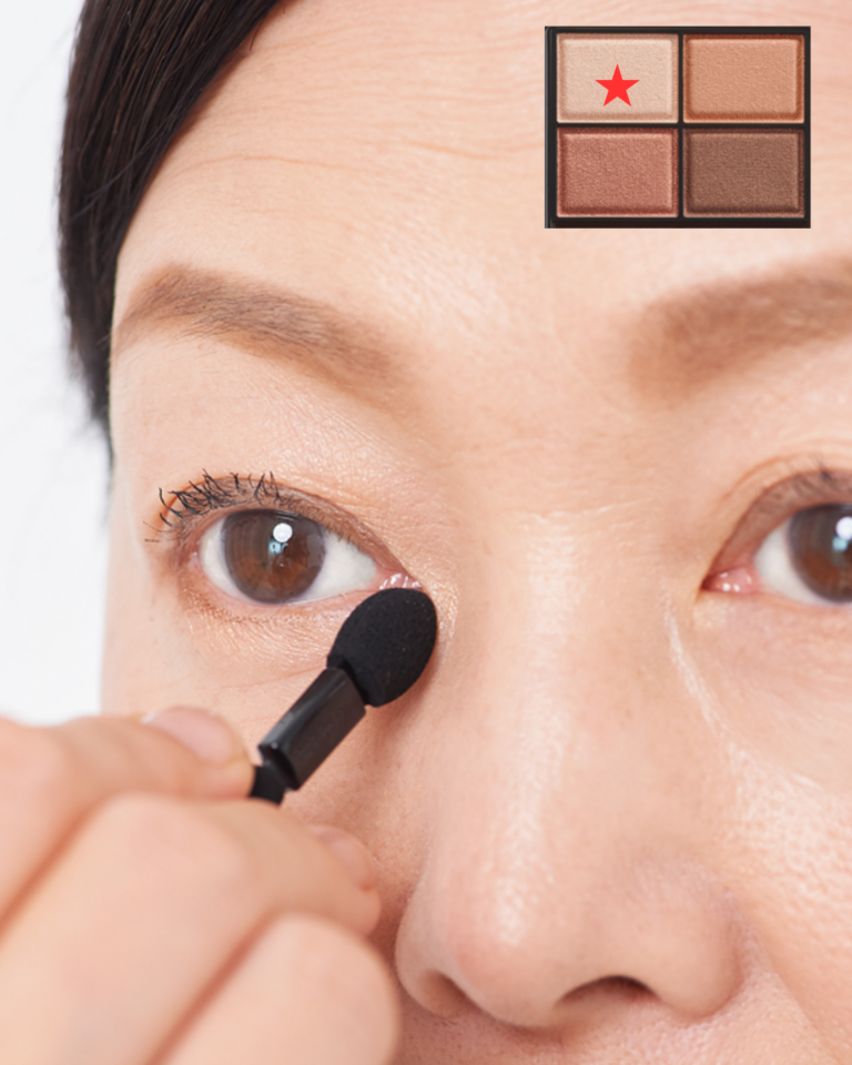 チップの先端にハイライトカラーを取り、目頭の「く」の字部分に塗る。瞳が潤って見え、華やかさがアップ。濃いブラウンを細チップに取り、下まぶたの目尻3㎜ほどのキワに塗る。全体が締まって印象が強まります。
