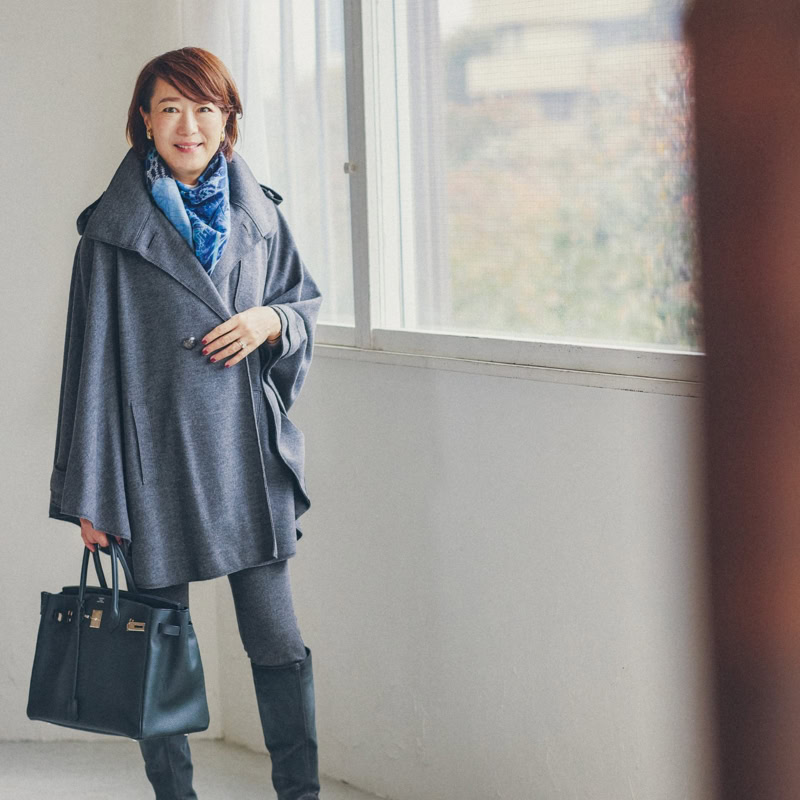 まだまだ続く寒い季節。そこで、防寒しながらおしゃれを楽しむコツを素敵世代の皆さんに教えてもらいました。今回は紅茶コンサルタント・林原真澄さんのマントが主役のコーデです。