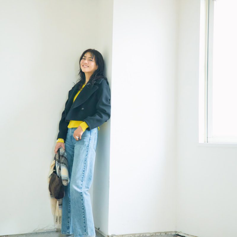 冬から春にかけて活躍するクロップド丈のコートは、ストレートジーンズをバランスよく魅せてくれる優れアイテム。淡いブルーと相性がいいイエローニットを効かせて、顔まわりを華やかに。
