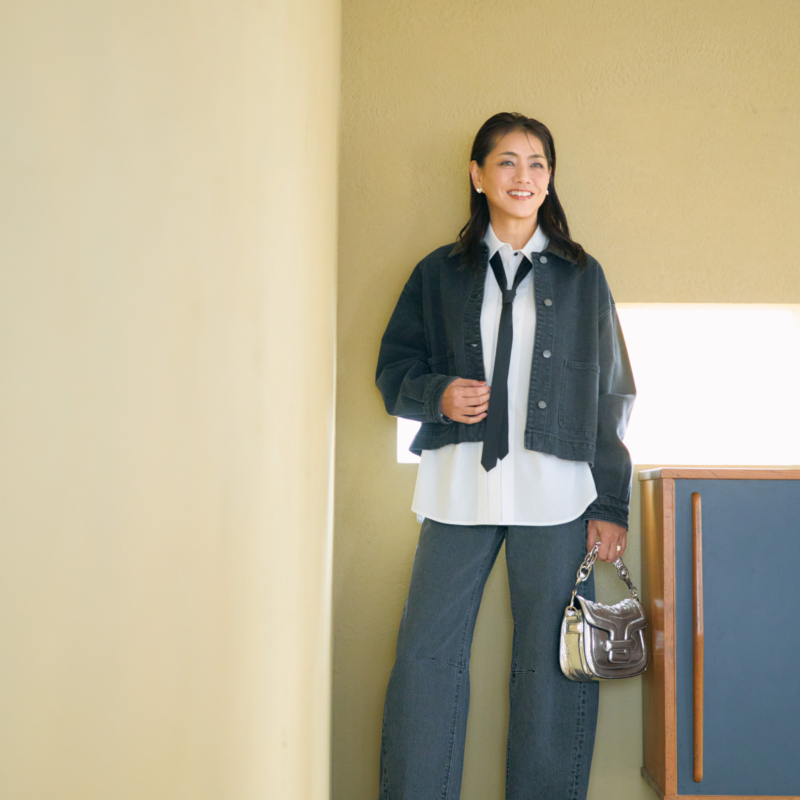 デニムパンツ¥2,990/ジーユー、デニムジャケット¥14,850/アバハウス マヴィ、タイつきシャツ¥19,800/ルージュ・ヴィフ(ともにアバハウスインターナショナル オンラインストア)、バッグ¥220,000/ピエール アルディ(ピエール アルディ 東京)、シューズ¥47,300/プリティ・バレリーナ(F.E.N.)、イヤリング¥19,800/アビステ、リング¥33,440/スタッシュ・ジュエリー(ズットホリック)、靴下¥880/靴下屋(タビオ)