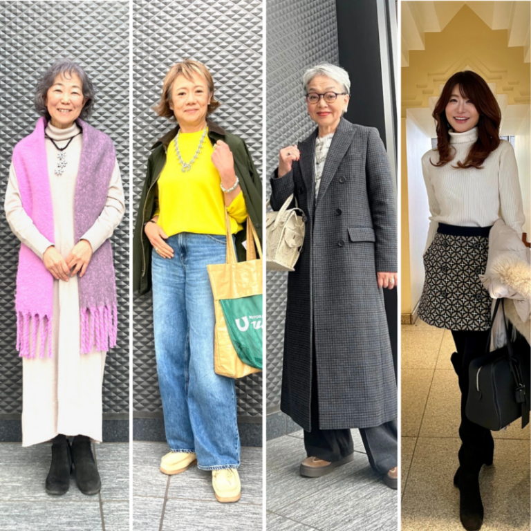 素敵世代の皆さんのおしゃれな着こなしをキャッチ! 「UNIQLO:C」のシックなロングコートを主役にした着こなしのほか、ビタミンイエローのニットやピンク×パープルのストールなどカラーを利かせた装い、そして脚長効果を狙えるミニスカートスタイルをご紹介します。