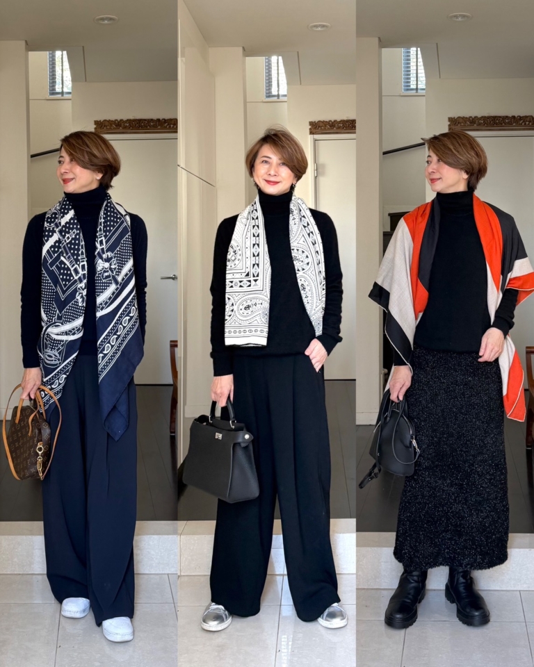 キーポイントは、ワントーンコーデとアクセサリー代わりになる華やかなスカーフです。