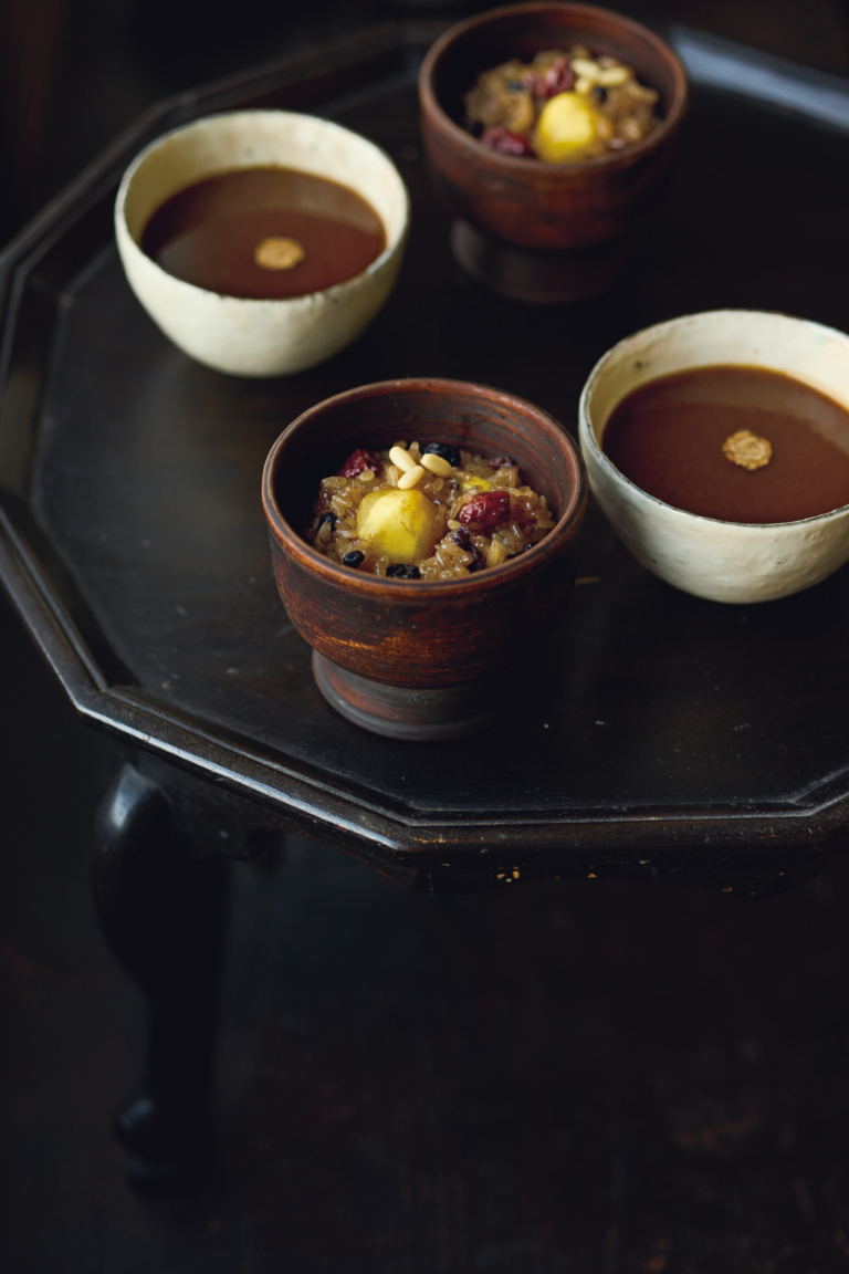 調味にカラメルやしょうゆ、ごま油などを使うことで、香ばしい風味や塩味を感じる上品な甘さに仕上げています。さらにドライフルーツや栗を足せば、味わいが単調にならず、食感もいいアクセントに。薬飯はお茶菓子としてもよく作る1品で、寒い時季には〝なつめ茶〟と合わせることが多いです。