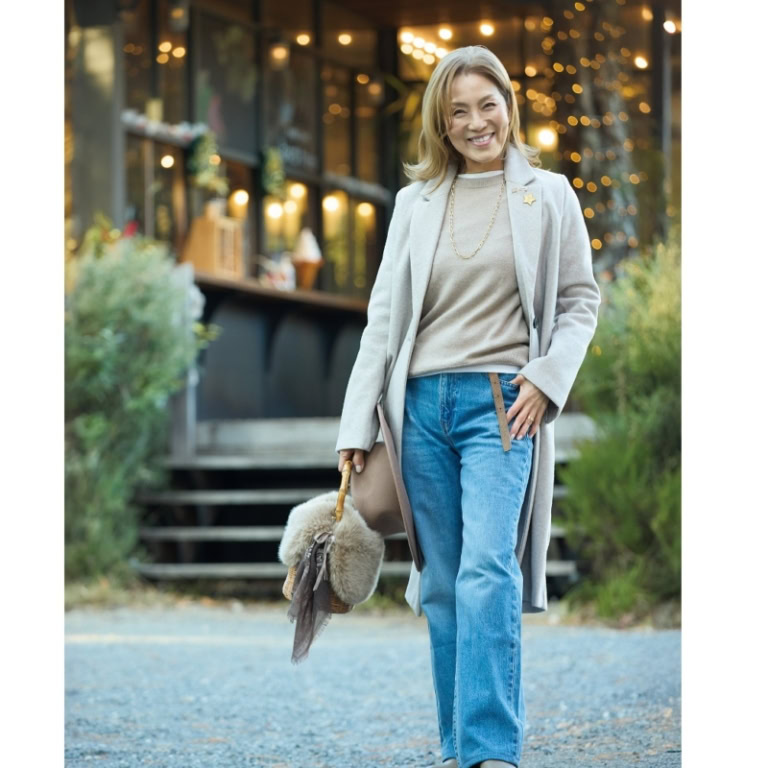 【第5位】【60代ファッションスナップ】「ユニクロ」のブルージーンズにベージュを合わせて上品な華やかさに。デニムはきれいめを意識するのが正解!【ユニクロ】