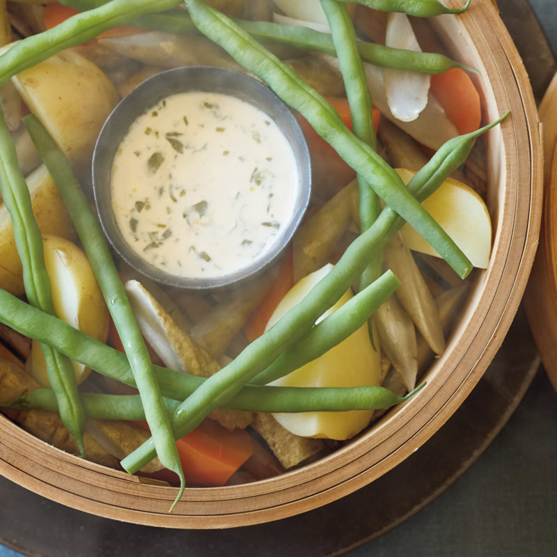 野菜と相性抜群の絶品クリームソースは 温かいほうが美味! せいろで一緒に蒸し、たっぷりつけて食べましょう。