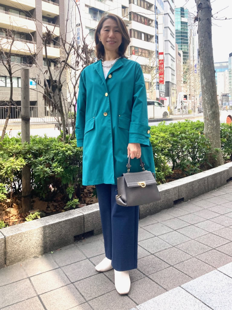「もともとモノトーンアイテムを使った着こなしなど、きれいめなスタイルが多め。でも今日は、春のような明るい気分にさせてくれる色のコートが気になって、ホライゾングリーンのスプリングコートをスタイリングの主役に。ネイビーのボトムスを合わせて、スプリングコートが引き立つように意識しました」