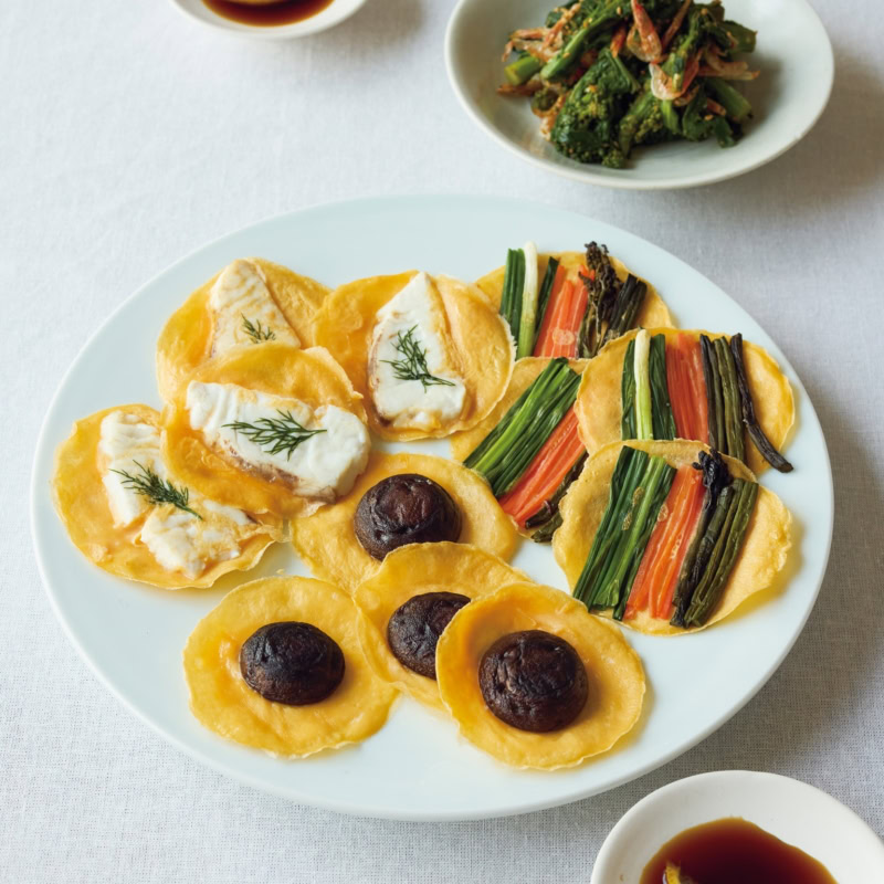 ジョンにはいろいろなレシピがあり、わが家のジョンは卵のやさしい味がベースになっているのが特徴。薄焼き卵の上には、どんな食材をのせてもおいしいので、和え物などの副菜や野菜の切れ端をのせても◎。法事やおもてなしで作る際には、食材をきれいに並べて焼くだけで、上質な1品に仕上がりますよ。