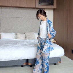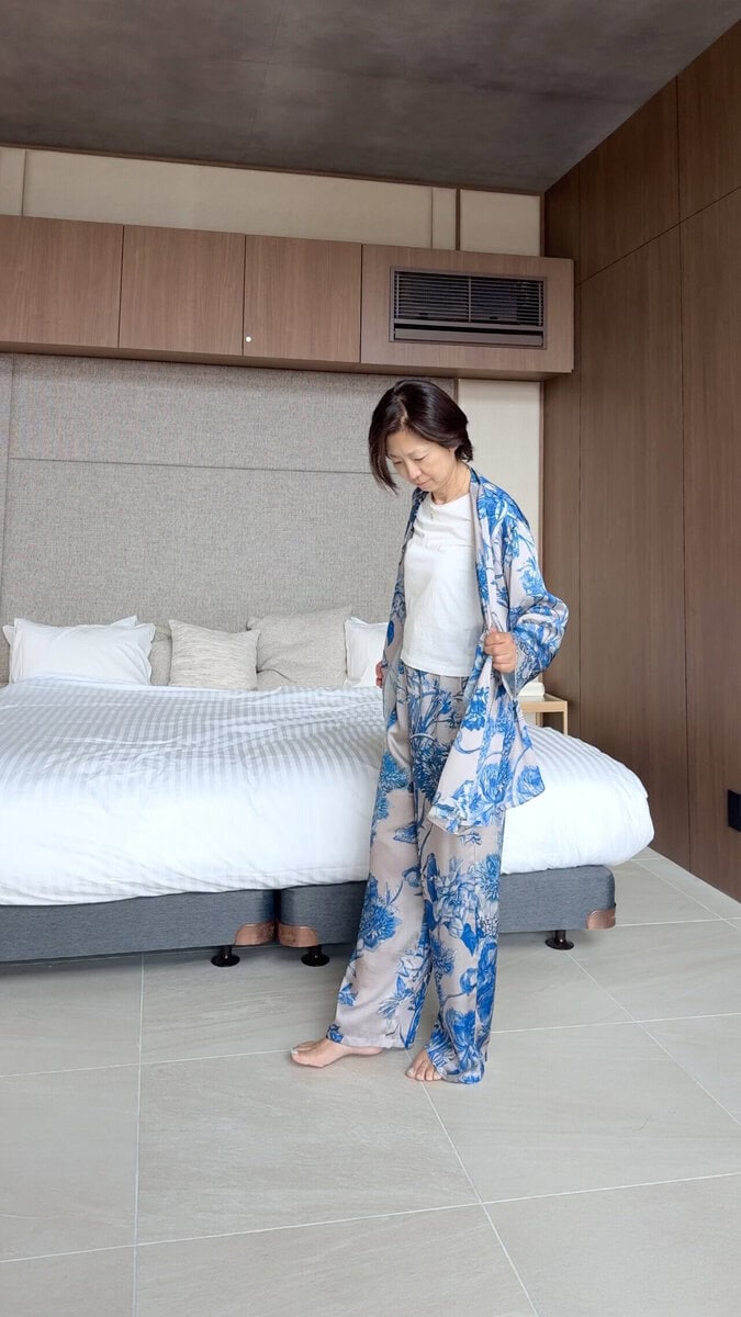 サブスク別荘With Sea真鶴の主寝室で。半袖、パンツのセット。