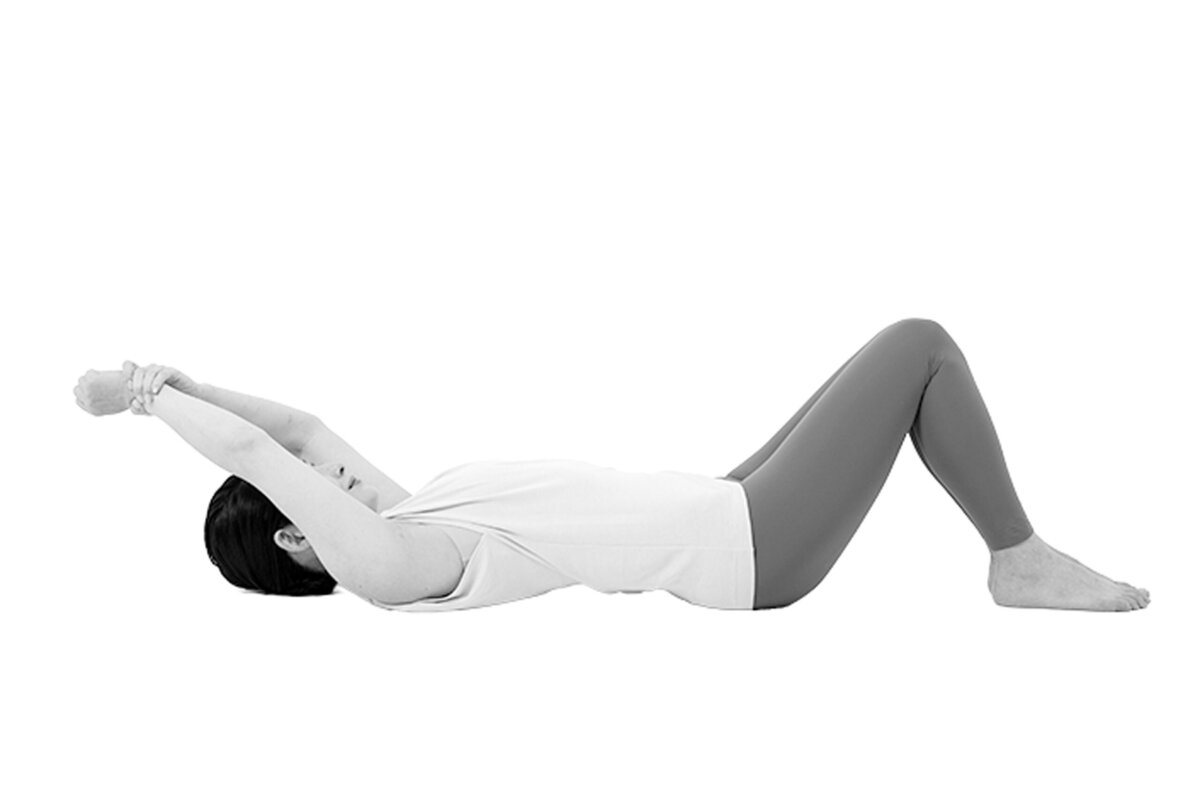 【1】ベッドや布団にあおむけになり、肩が痛いほうの手首を反対の手でつかむ。