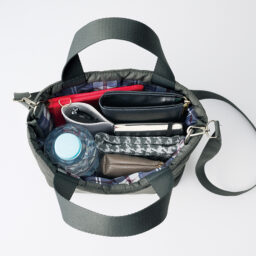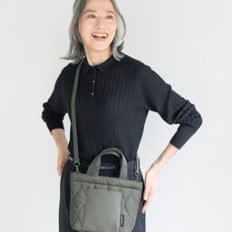 見た目はコンパクトながら、長財布・手帳・リーディンググラス・ポーチ・500mLペットボトルまでしっかり収まる安心の収納力。お出かけに必要なものをスマートに持ち運べる頼れる存在です。