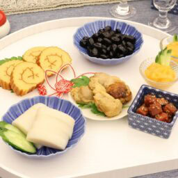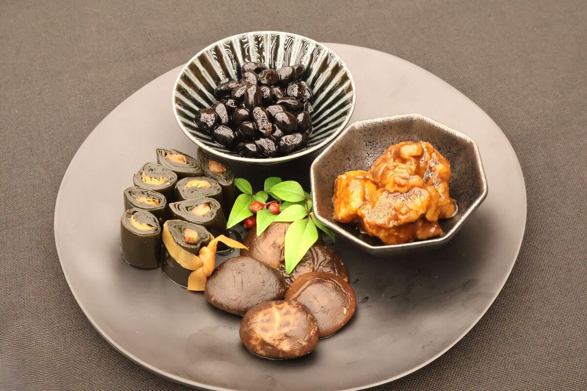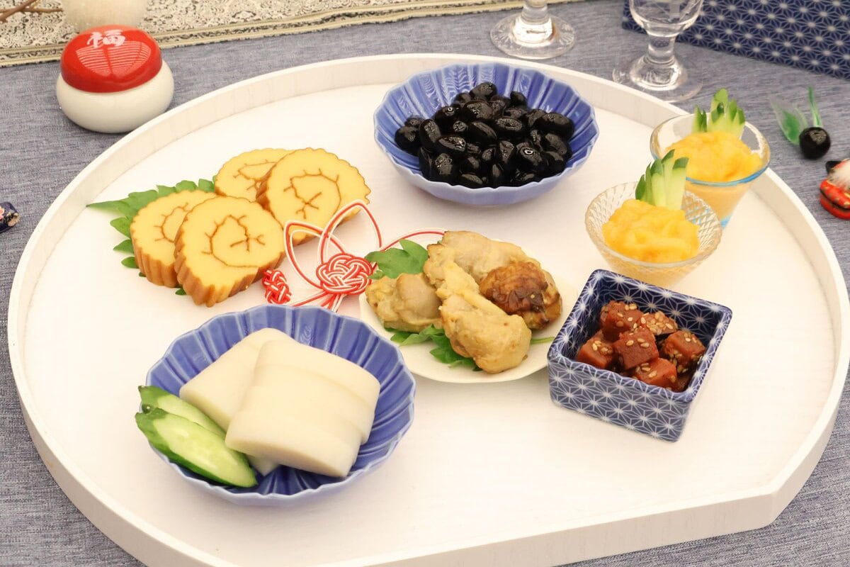 盛りつけ例 ローソンストア100「選べるおせち」の「ごちそうおせち」(計3,240円分)