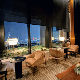 美しい廊下の奥に「ラウンジ」が、手前にはレストラン「Viridis」があります。