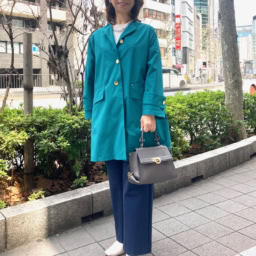 「スプリングコートの色が重たく沈んで見えないよう、トップスとシューズはクリーンで爽快感のある白アイテムをセレクト。コートのグリーンと喧嘩せずに明るく華やかに見えるアクセントに」