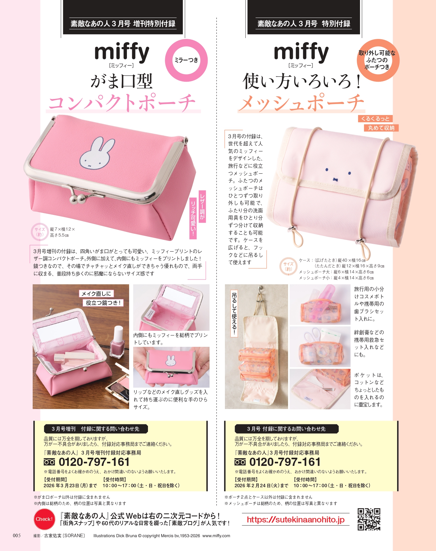 【雑誌付録紹介】『素敵なあの人』2026年3月号は、ミッフィーをデザインした付録が異なる2種類! 通常号がメッシュポーチセット、増刊がミラー付きコンパクトポーチ