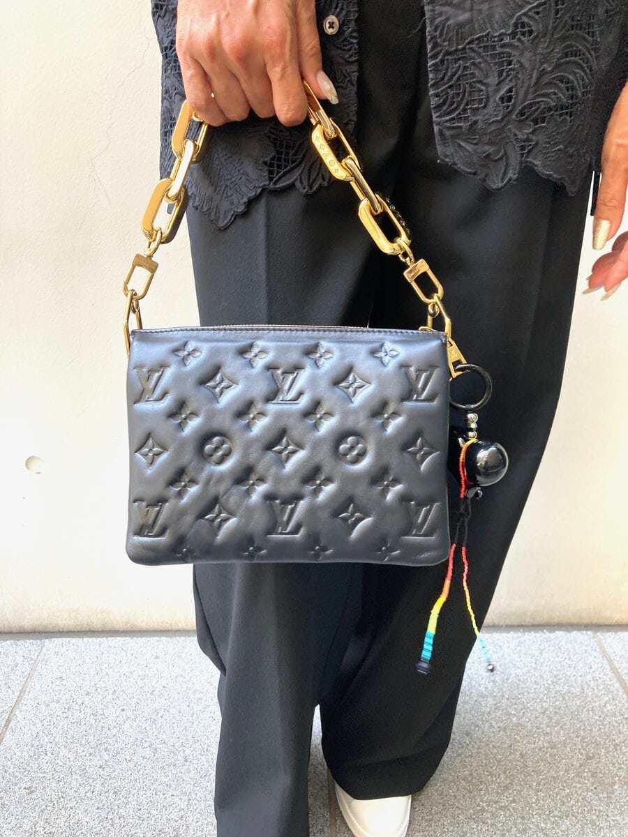 「ルイ・ヴィトン」のバッグ。「このサイズ感がかわいくて購入。あとポイントは、ショルダーのゴールドチェーンですね!持つだけで華やかになります。付けているストラップはインスタで見かけて買いました」