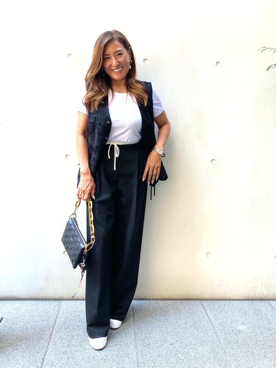 素敵なあの人のイベントに参加をしていたセリさん。「クールながら女性らしさを感じる『TOMORROWLAND』のレース生地のジレでコーディネート。ボトムは動きやすく、『ZARA』のウエストゴムのパンツで合わせました。シンプルな白Tに羽織るだけで、きちんと感が出ます」