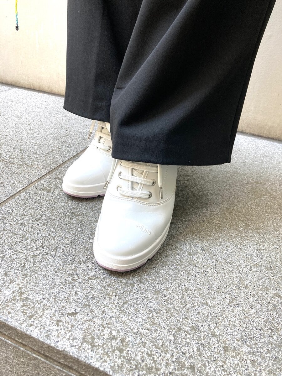 「DIANA」のスニーカーは、とにかく歩きやすいそう。「移動が多い日はもっぱらスニーカー。歩きやすさ重視です!足元が軽やかな印象になる白シューズにしたことで、カジュアルすぎないようにまとめました」