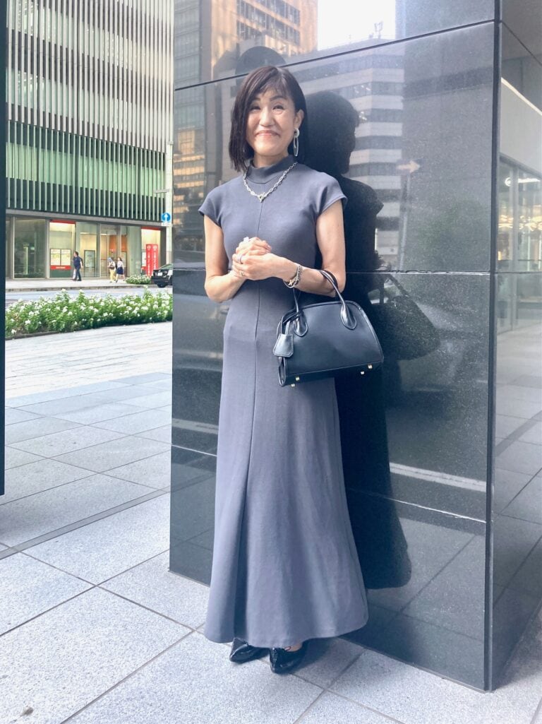 バッグは「ウィム ガゼット」。「グレーと同系色でまとめました。ワンピースのカラーになじんでいい感じ。このバッグ、コンパクトに見えて収納力があるのでかさばる荷物や本も入って重宝しています」