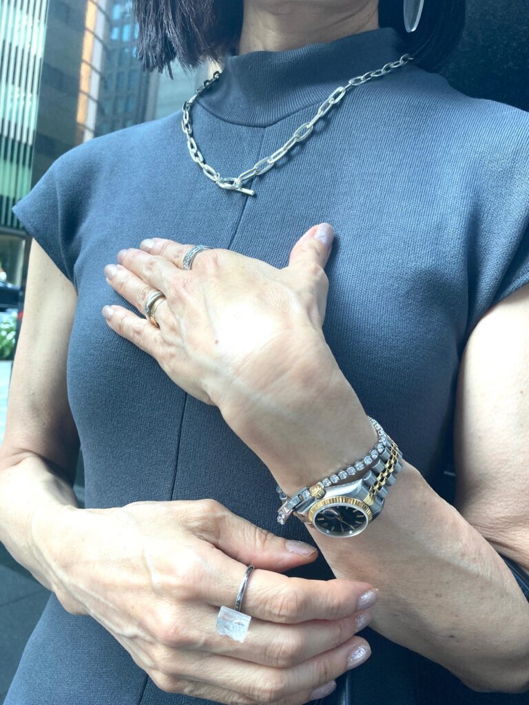 以前、カラー診断を受けてシルバーが似合うと言われた山田さん。「最近意識をしているせいか、シルバーアクセサリーを身につけることが多いですね。『ロレックス』の腕時計は、シックにまとめたくて文字盤がブラックのものを購入し、シルバーアクセサリーと重ねづけしています」