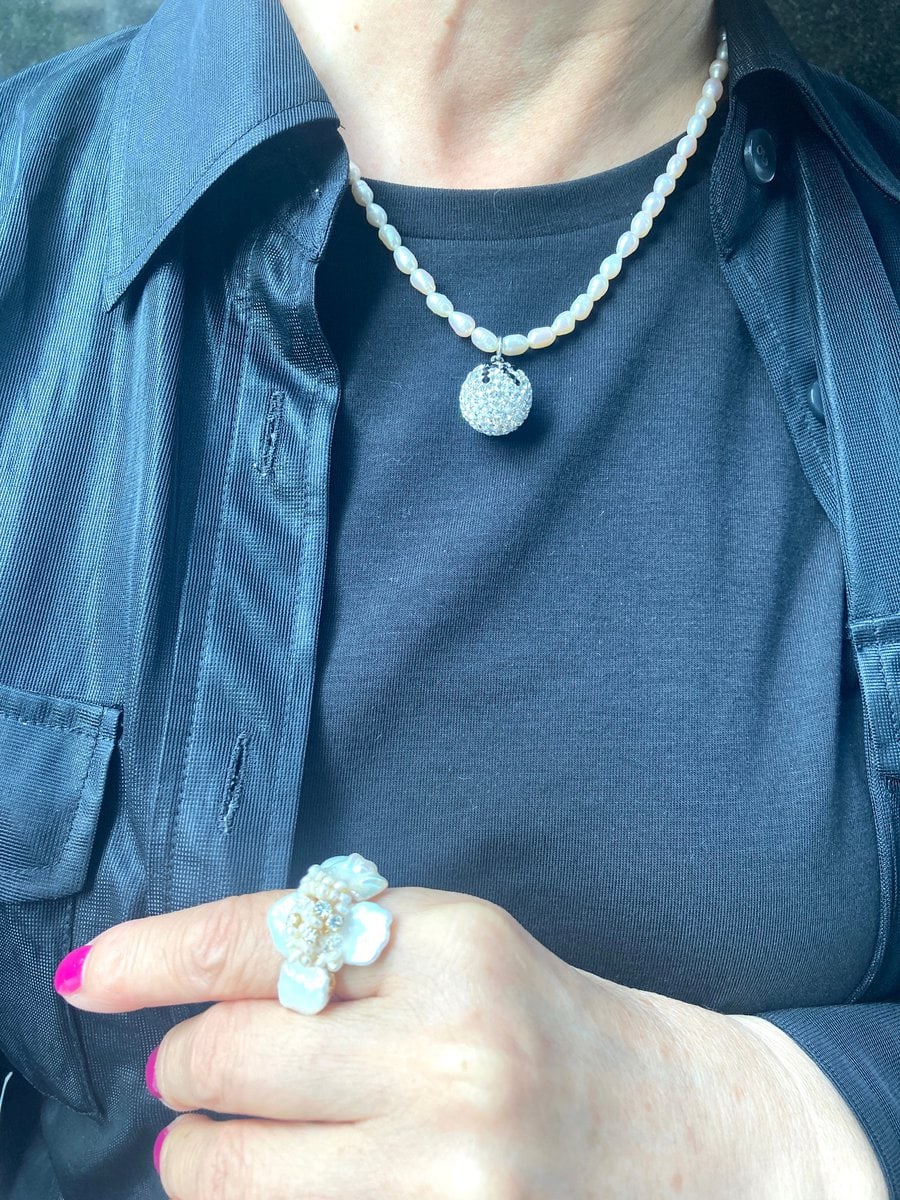 「パールのネックレスは、お友達に伊勢志摩のお土産でいただいたもの。それに、推しのディナーショーでもらったキーホルダーの飾りをつけてアレンジ。いつでも身につけられてうれしいです。リングはアクセサリー作家さんのもの。夏につけたいホワイトで、程よいボリューム感がいいなと思い購入しました」