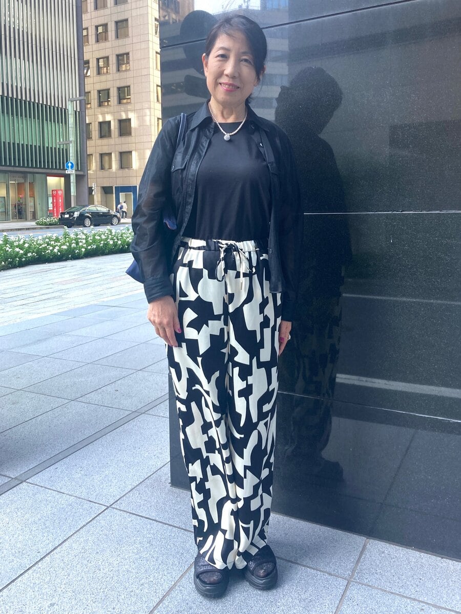 「派手な柄を身につけると元気が出る!」という本多さんの言葉に納得。大柄のパンツを素敵に着こなす本多さんを見ているこちらまで元気をもらいました。エアリーなシアートップスなので黒の重さは感じず、丈感もバランスがいいスタイリッシュな着こなしですね。