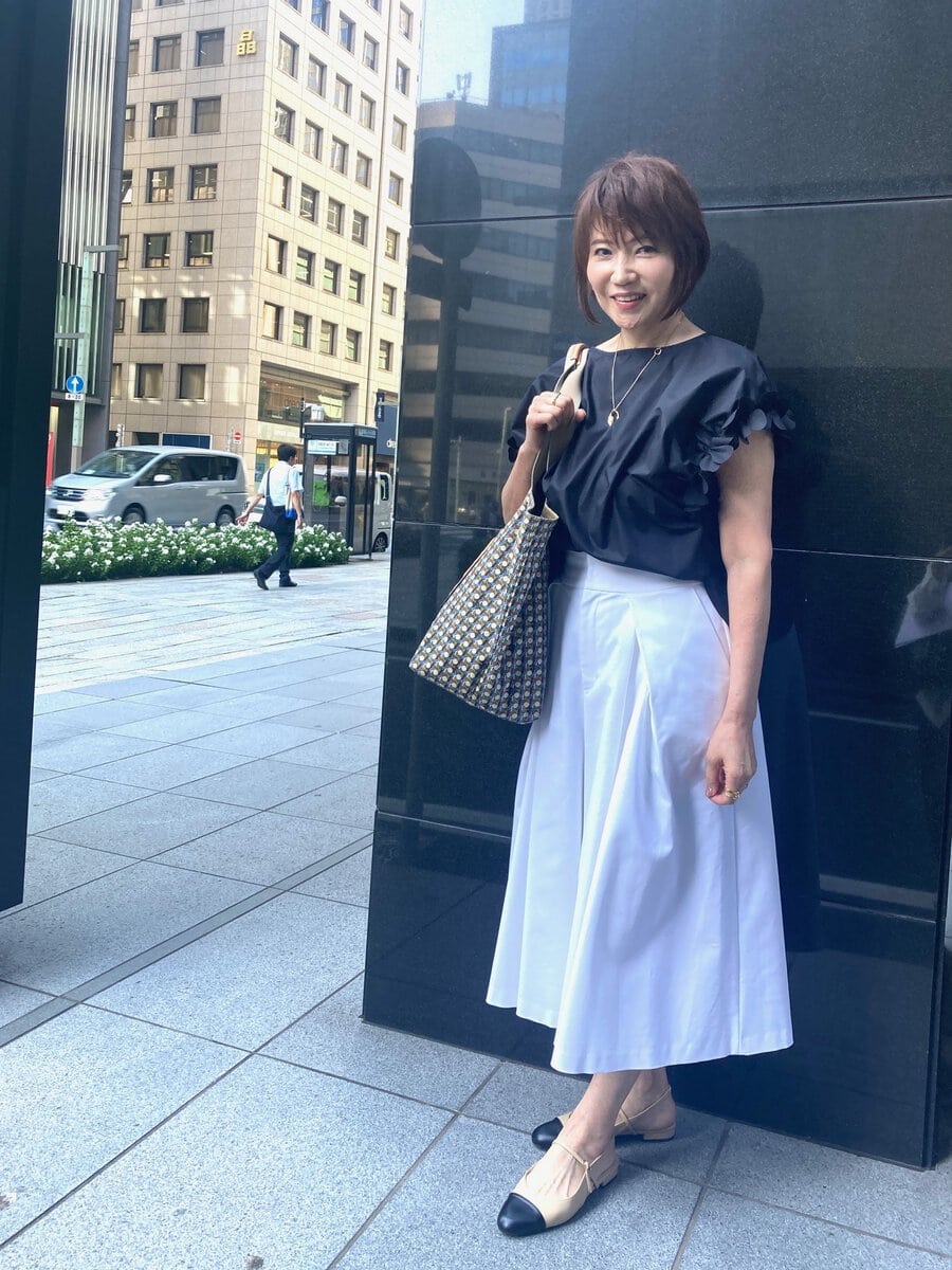 実はスカートではなく、ワイドパンツだと言われてびっくり!風になびくワイドパンツの緩やかな感じと、光沢のあるトップスがとてもよくお似合いでした。バイカラーのサンダルも、コーデカラーにマッチしていて、おしゃれ上級者の着こなし。
