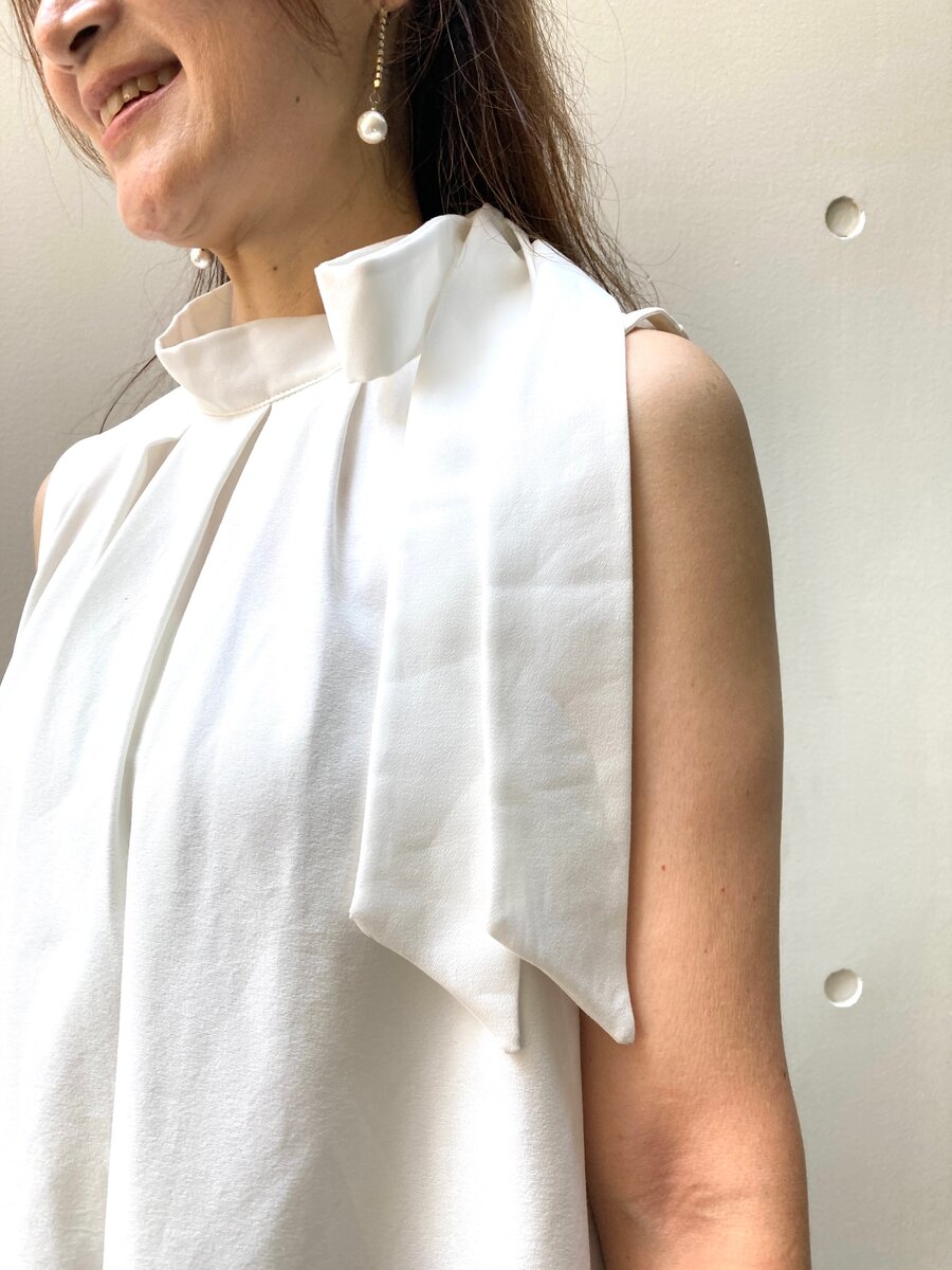 「『CAWAII』のこのシャツは、首周りのデザインも好きなのですが、大きめのリボンがポイントです。太い2本のリボンは自由にアレンジができるので、結んだり垂らすだけでも雰囲気が変わります。そしてやっぱり、白をトップスに持ってくると顔周りが明るくなりますよね」