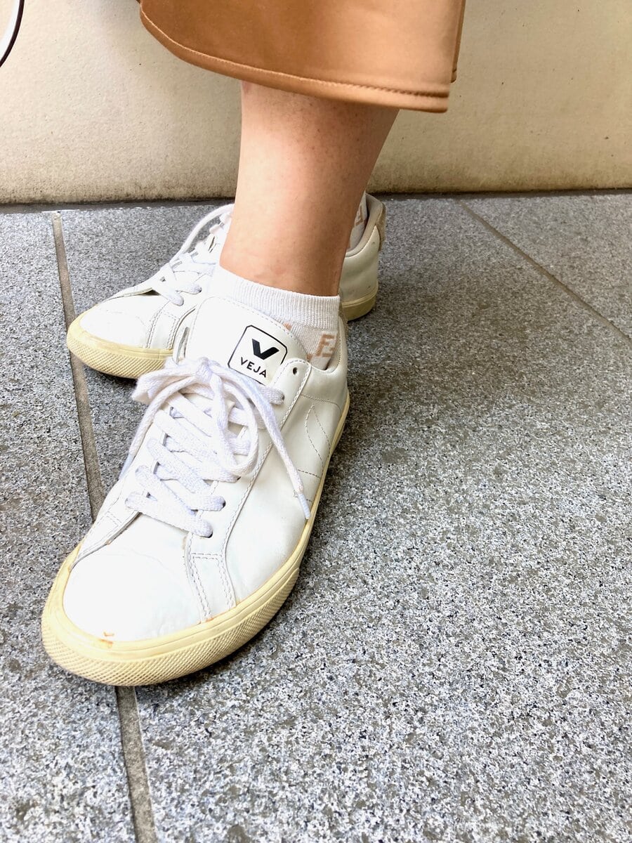 最近、スニーカーをはき始めたという岡野谷さん。「大人カジュアルに決めたい時は『VEJA』の皮素材スニーカーが使いやすい!明るい色合いのコーデになじむんです」