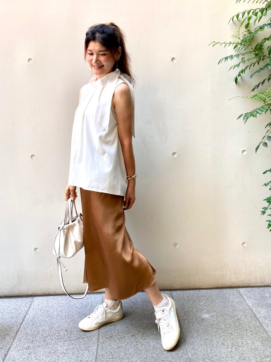 トレンドのサテンを取り入れたコーディネイトが魅力的でした。このスカートは形がとてもきれいで、トップスのシャツの長さとのバランスが絶妙!華やかなサテンとリボンの上品フェミニンコーデにまとまっていました。