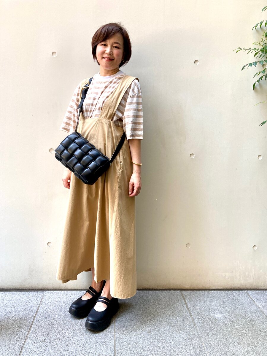 「『ヒューマンウーマンの』ジャンパースカートに、黒の『ボッテガ・ヴェネタ』のバッグを合わせることで、モードな存在感がプラスされ品よくまとまります」