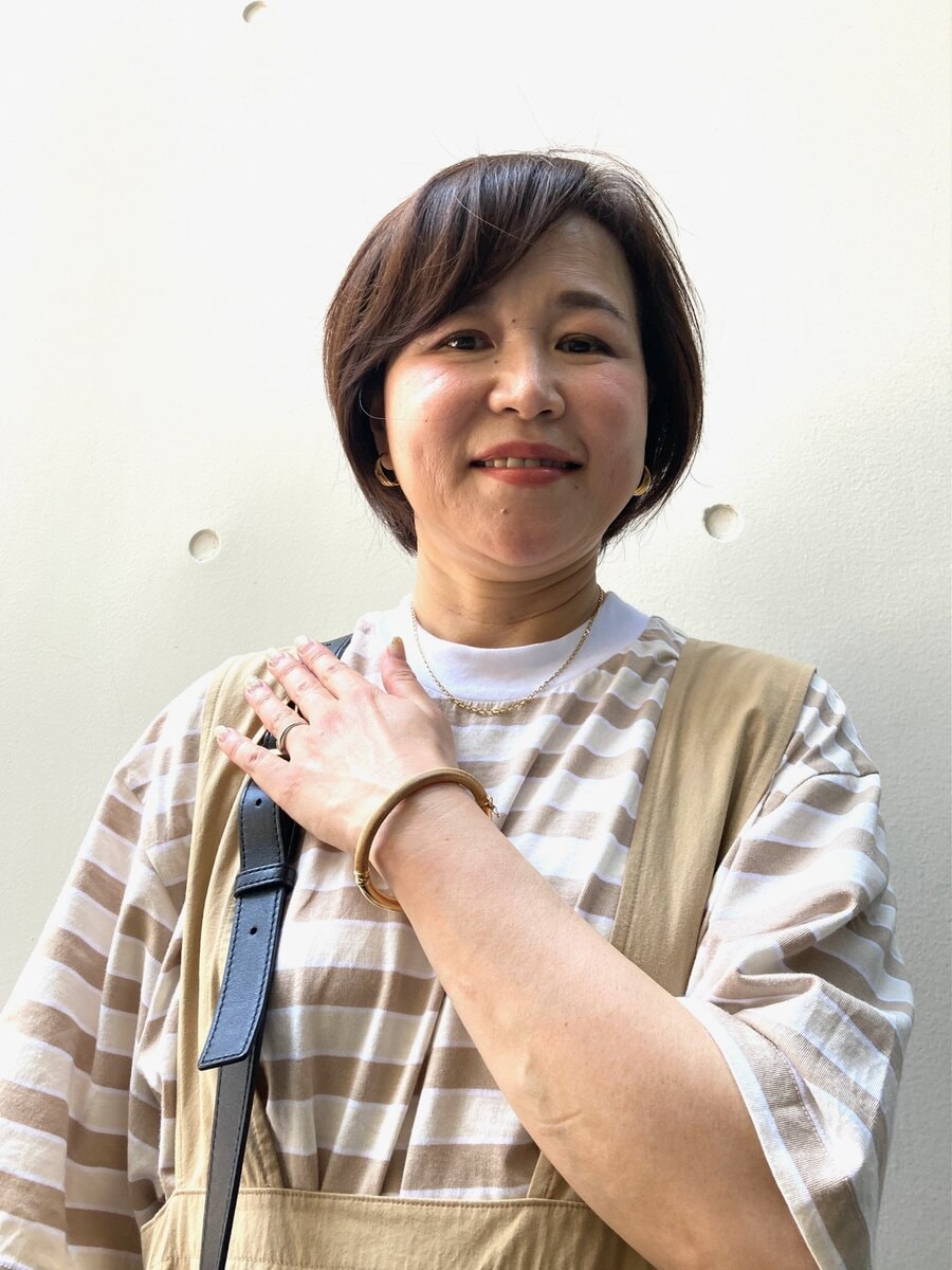 「バングルは『ウノアエレ』。さりげなくベージュコーデになじむゴールドをセレクト。『マルニ』のボーダーTシャツと色のトーンを合わせました」