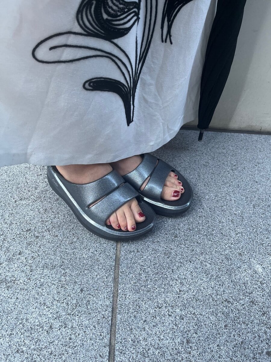 「『ウーフォス』の厚底サンダルは、黒にラメが入った限定カラー。リカバリーサンダルなので履き心地が快適ですが、厚底でカジュアルになりすぎないので、お出かけのときに重宝しています」