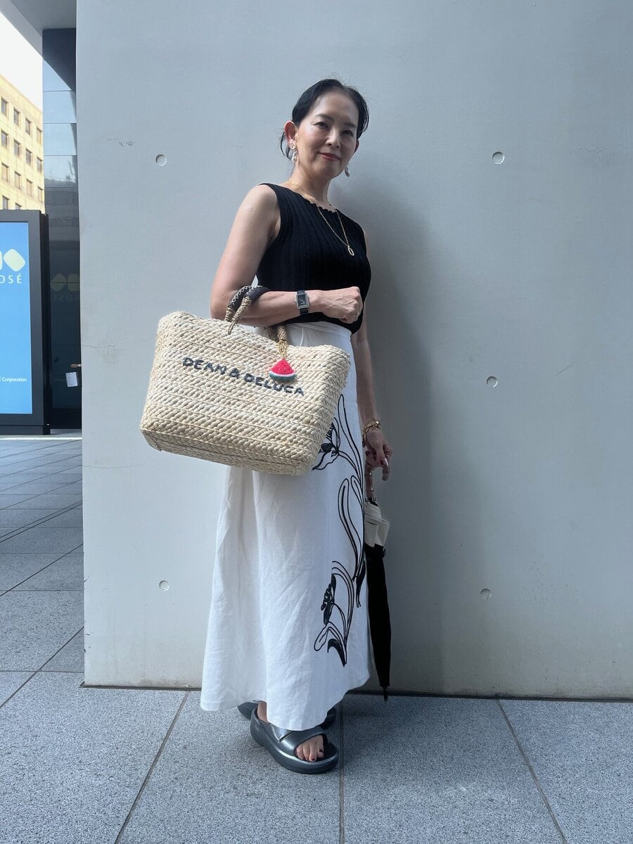 大きな刺しゅう柄のスカートが、とても清楚で涼やかでした。ロングスカートにボリュームがあるので、「アルマーニ」のトップスをインしてコンパクトにすることで、全身のバランスがよく洗練された印象に!同じく刺しゅうの入ったかごバッグは、おしゃれなだけでなくかさばるものもたくさん入って使いやすそうでした。スイカのチャームがキュートでコーディネートのアクセントになりますね。