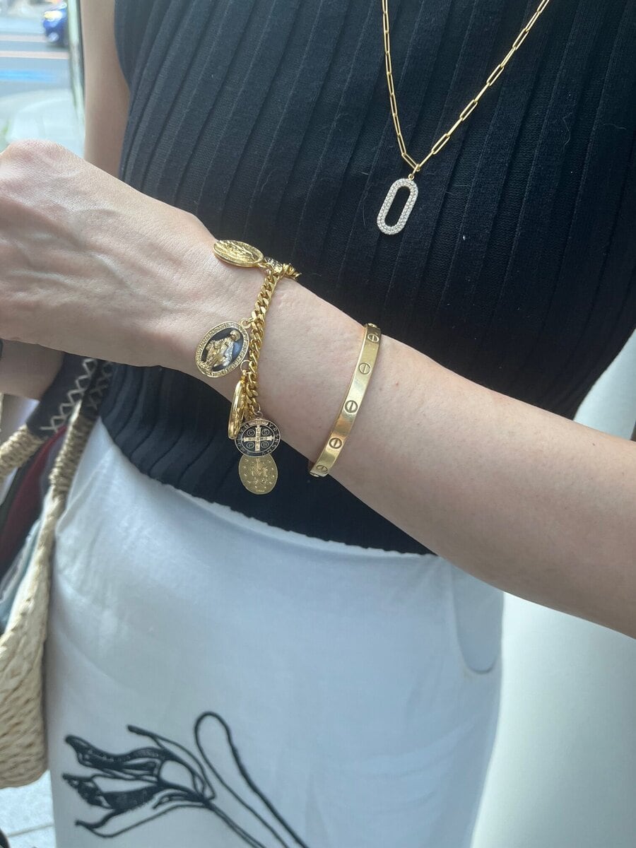 「バングルは『カルティエ』。重ねづけしているのは『Amiged』。ラフォーレ原宿にショップがあって、ヴィンテージボタンやチャームをセレクトして、その場でブレスレットやネックレスができるアクセサリーブランド。普段からゴールドアクセサリーが多いので、ゴールドのパーツを選んでみました」