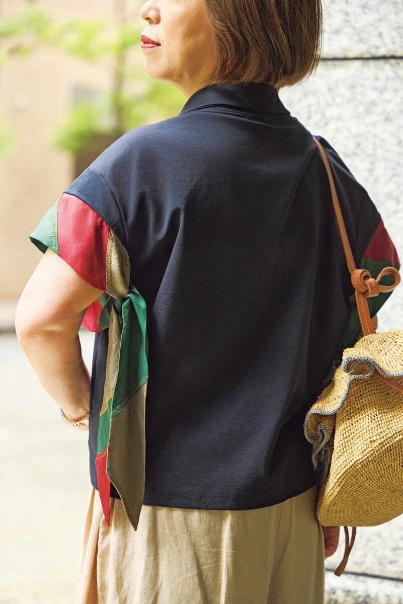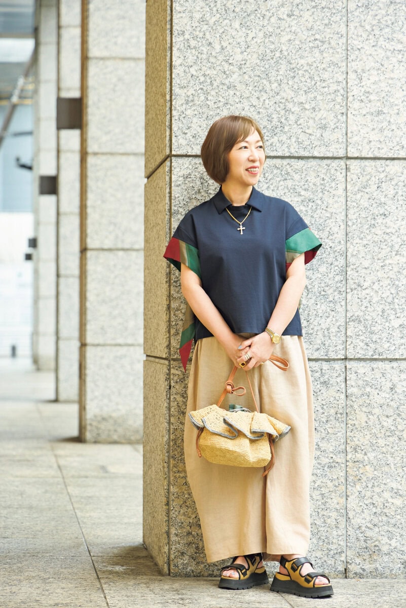 パンツ、サンダル、バッグはベージュに統一し、お気に入りの「カラー」のトップスに視線を集めたコーディネート。「トップスの袖リボンと、ゆったりシルエットのカーヴィパンツが風になびくと軽やかな感じが出て、夏にぴったり」。「メイドインマダ」のフリルバッグがアクセントに。