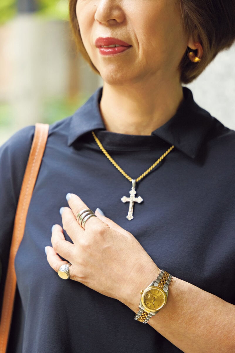 「アクセサリーはゴールドとシルバーをミックスし、トレンド感を」。シルバーは「コン リトゥモ」、ゴールドはイタリアンジュエリー。