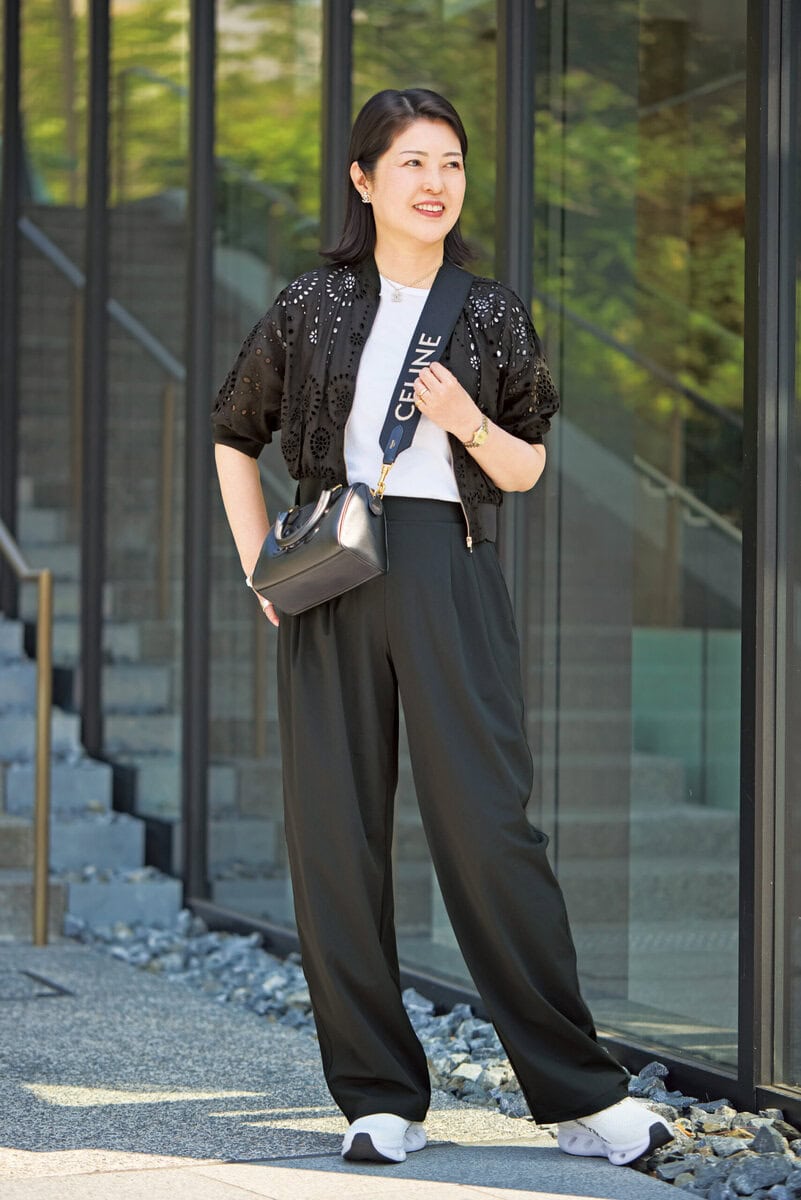 すっきり見えと動きやすさ重視でスタイリングするという田中さん。この日はモノトーンでまとめたスポーティな装い。色を絞り、透け感や落ち感など素材感を変えメリハリをつけています。「『ユニクロ』のパンツはウエストゴムで楽なのにきちんと見えして優秀」